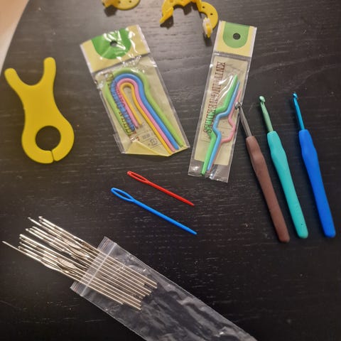 DIY-kit med garn, heklenål og bruksanvisning. Sjiraffen blir ca 17 cm høy