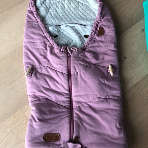 Fra nett: Voksi Move Light 20 er en lett og pustende bilstolpose for helårsbruk, med bomull innvendig og resirkulert polyesterfyll. Passer fra nyfødt, og kan brukes både i bilsete og barnevogn.