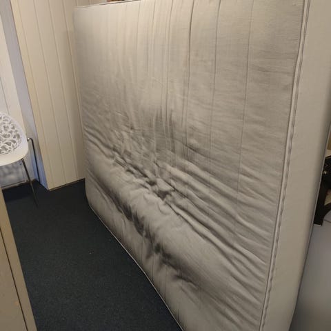 1.50 seng gis bort, god fjøremadrass uten bein. Er et par flekker på den