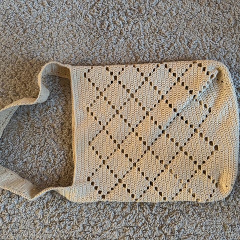 Nydelig heklet veske. Laget i kremhvit bomullgarn med vakre blomsterdetaljer. Vesken har stofffôr på innsiden og lukkes med dekorativ knapp.