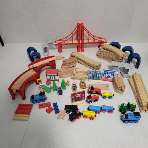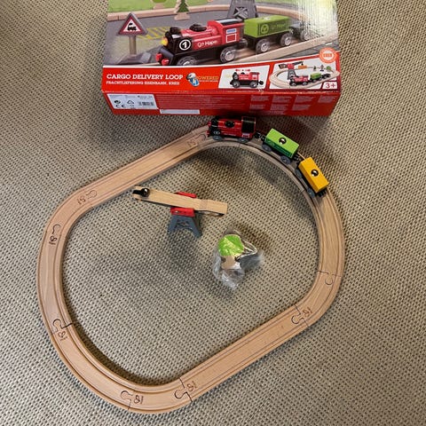 OVER 8KG BRIO Togbane sett med ulike trebanedeler, inkludert sporveksler, skinner, ferge, tog og tilbehør. Passer for barn og kan brukes til å bygge forskjellige togbaneoppsett. Materiale i tre og plast.