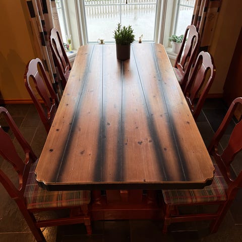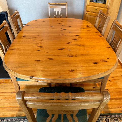 Solid spisebord og 6 stoler selges samlet.