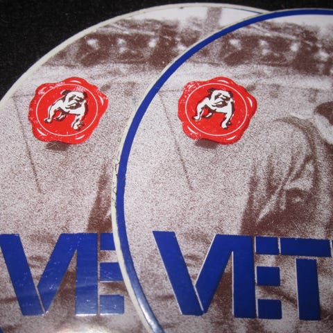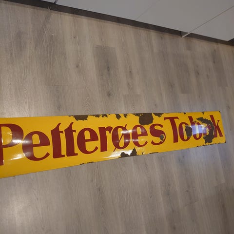 Emaljeskilt av Petterøes tobakk med bulldogen, buet form.
