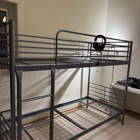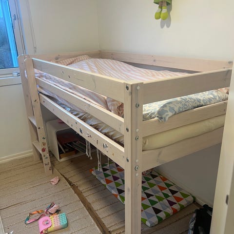 Her får du en solid barneseng med trygg trapp, og mange smarte oppbevaringsløsninger. Selv er vi veldig fornøyd med sengen, og selges grunnet overgang til hver sitt rom. Veggen i hyllene til hver seng kan snus og fargen byttes til brun. Følger med skuffen under som kan trekkes ut, samt madrasser x3