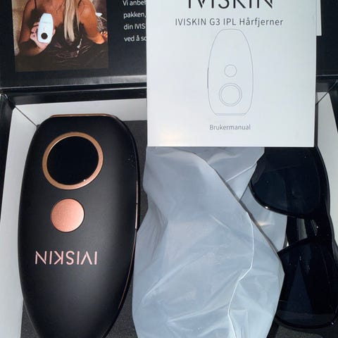 IVISKIN IPL hårfjerner. Enheten bruker intens pulserende lys (IPL) for hårfjerning. Produktet leveres med tilbehør og oppbevaringseske.