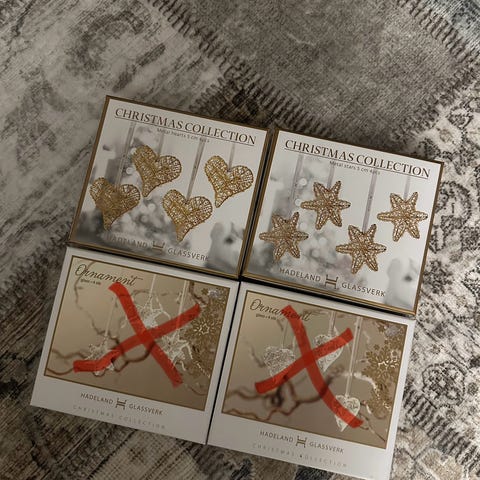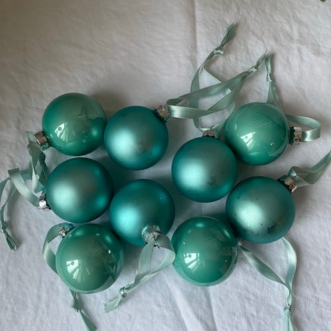 Hadeland Glassverk julepynt sett med fem glasskuler i forskjellige farger (blå, grønn, klar). De vakre, karakteristiske kulene fra Hadeland, ligger i originaleske og er ikke brukt. 5 cm høye.
