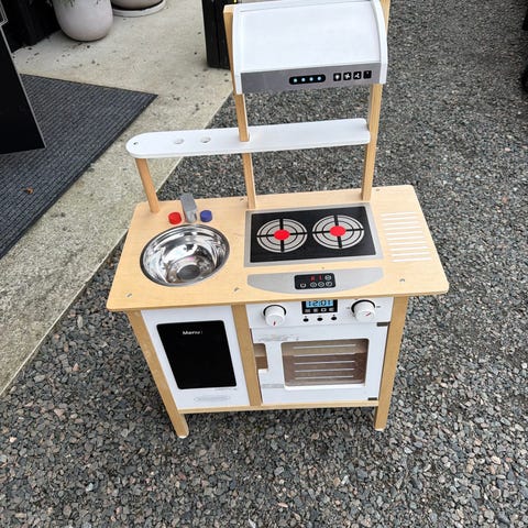 Selger et flott lekekjøkken med masse lekemat og leke-mikrobølgeovn. Perfekt for rollelek og kreativ lek for barn.