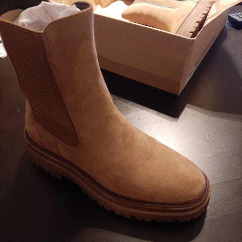 Støvler i størrelse 38. Støvlene har glidelås på innsiden og en blokkhæl. Materialet er svart og har en glatt finish.