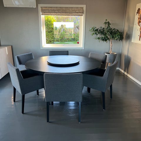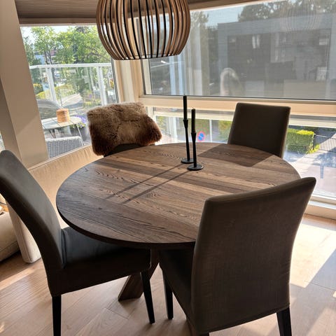 Fin spisegruppe til salgs. O 120 cm, blir 170 cm med ileggsplatene. God plass til 4 rundt bordet og til minst 8 med platene.