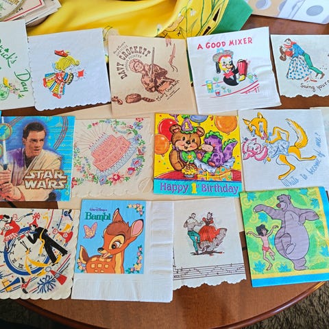Utvalg av servietter med forskjellige mønstre og motiver, inkludert blomster, hjerter, vintertema og kjøkkenrelaterte bilder. Passer til decoupage og scrapbooking. Over 65 servietter, gjerne to av hvert motiv, noen er det flere av. Bildene viser de forskjellige motivene. I god stand, alle er intakte, men noen hjørner og kanter er bøyd.