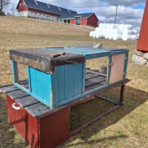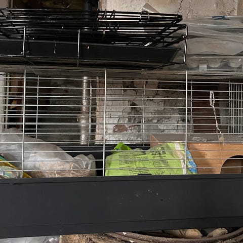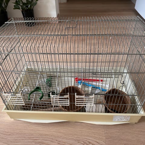 Bur på 115x58 cm, sekk med fór ca 1kg, vann/matskåler, gitter for å høy, 2 stk toalettskåler.