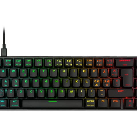 Tastatur med hvite taster og RGB-belysning. Tastaturet har mekaniske brytere med gjennomsiktige deksler som viser lys. Produktet er beregnet for bruk som ekstra tastatur til datamaskiner.