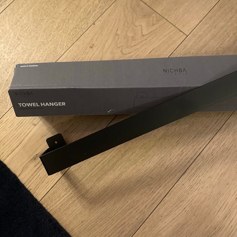 3 stk håndkleholder og 1 stk hylle i svart metal selges samlet til 150 eller 50 kr pr stk