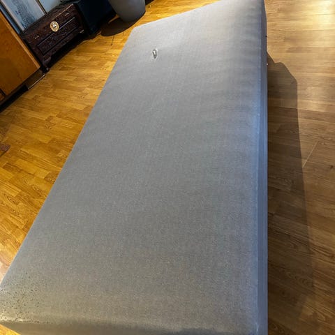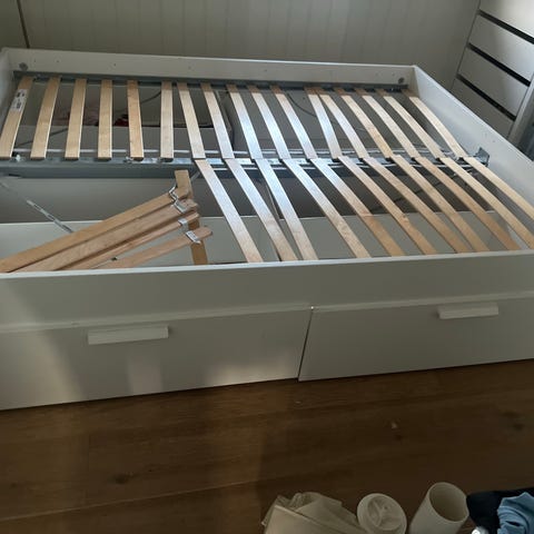 Brukt seng gis bort. Det er noen bruksmerker på den. Senga er demontert.