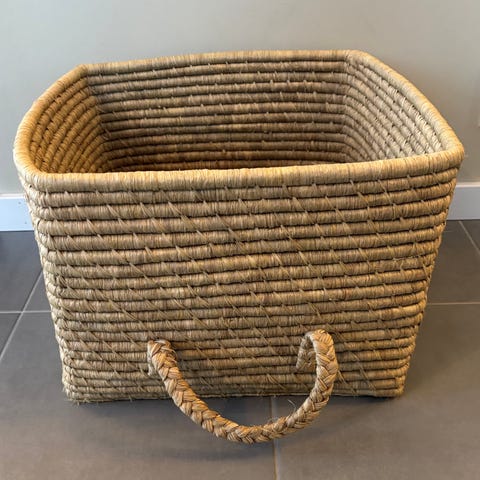 Rice raffia oppbevaringskurv er håndlaget av naturmaterialet raffia, bladene fra raffiapalmen, og passer utmerket både i en hylle, på en kommode eller på et bord. Kurven gir en herlig følelse i hjemmet og er enkel å bære med seg ved hjelp av håndtakene av skinn.