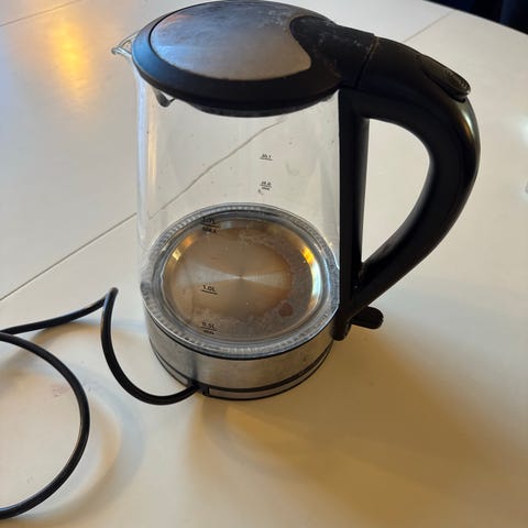 Svart vannkoker med kapasitet på 1,7 liter. Godt brukt, liten skade foran (se bilde), men funker fint 😊