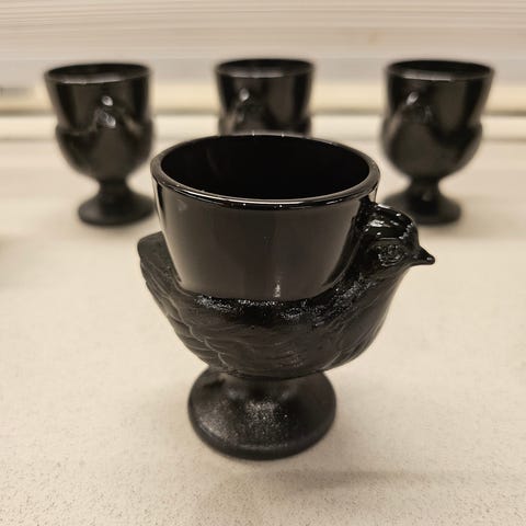 Eggeglass (6 stk.) fra Arcopal France Veronica selges samlet for 275 kroner (høyde 5,6 cm / diameter 4,7 cm). K11. Fraktkostnader: PostNord - 69 kroner. Betaling via vipps.