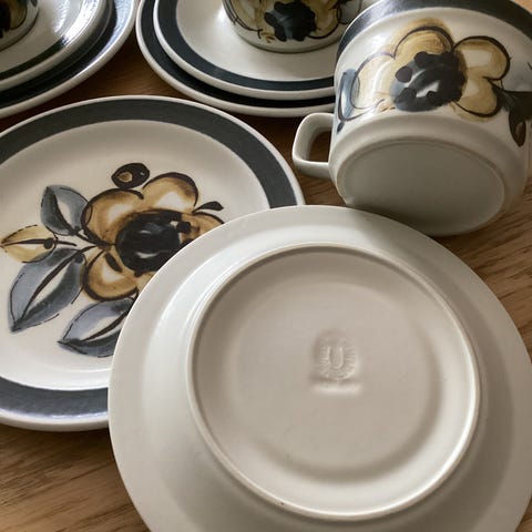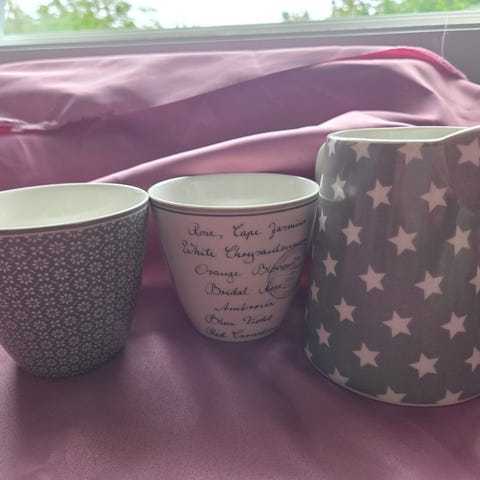 Selger et vakkert sett fra danske GreenGate i det populære Fay Blue-mønsteret. Settet består av en stor kanne/mugge og et krus/kopp uten hank, begge i upåklagelig stand.