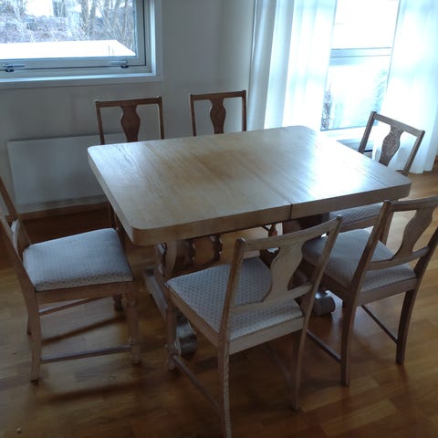 Stoler med skinnsete 6 stk er med på kjøpet.