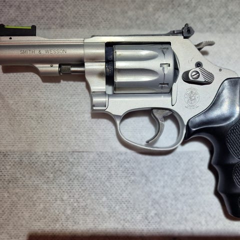 En veldig tro kopi og virkande co2 pistol av S&W sin -686 police revolver.