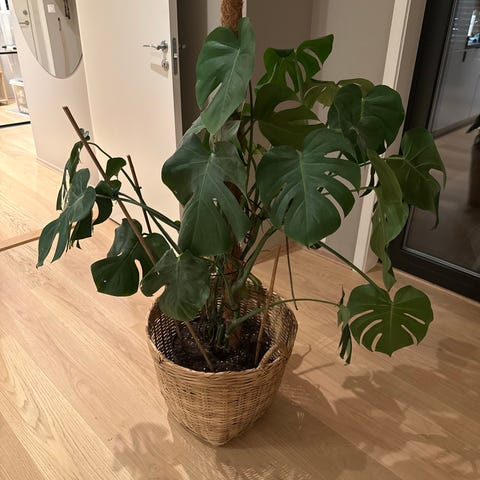 Monstera Deliciosa stueplante med store grønne blader. Planten er egnet for innendørs bruk og krever moderat lys og vann. Bladene har karakteristiske hull og snitt, som gir et dekorativt utseende. Selger med potteplanter