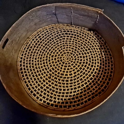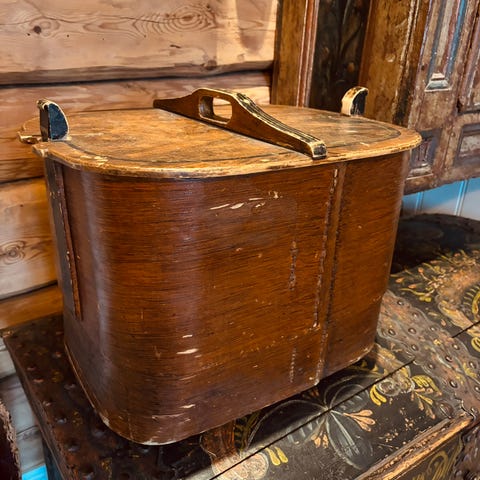 Håndlaget tine/skål/oppbevaring - laget i never med trebunn og håndkåret trelokk, med lærhåndtak. Ikke én eneste spiker.