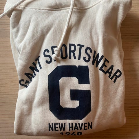GANT hettegenser i blå farge, størrelse S. Genseren har hette med snøring og frontlomme. Stor logo i front.