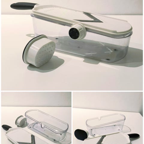 Medfølger 7 ulike typer kniver. Mandolinjernet er utstyrt med syv ulike skjæreflater: fin og grov strimler, fin og grov rivjern, fin og grov kutter samt en klassisk mandolinkutter. Dette gir deg full kontroll over snittet – uansett oppskrift. Verktøyet rommer 1,2 liter og passer best med råvarer som ikke overstiger 8 cm i bredde. Kompakt i størrelse, men stort i funksjon.