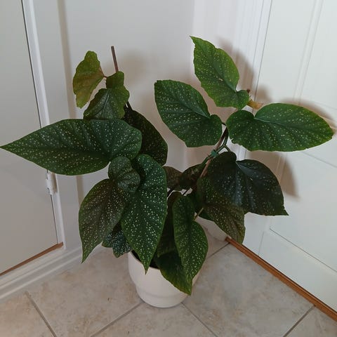 Ficus elastica potteplante med store, blanke grønne blader. Planten er plassert i en hvit potte. Egnet som innendørs plante for dekorasjon og luftforbedring. Selges da den har blitt litt for stor