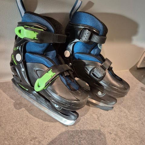Pro Flyer Boy regulerbare ishockeyskøyter for barn i størrelse 34-37. Skøytene har svart og blå farge og er designet for ishockeysport. Kan hentes i sentrum nær Kompis på torvet