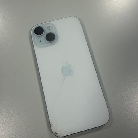 iPhone 15 128GB selges. 85% batteritilstand. En skade nederst i hjørnet og sprekk i skjermen. Som man ser på bildene er ikke sprekkene synlig ved vanlig bruk, men man ser dem om man holder mobilen skjevt. Ellers er den hel og pen rundt og på baksiden.