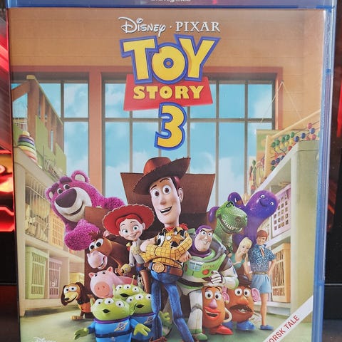 Disney Pixar Toy Story 3 Blu-ray med to disker. Inneholder filmen Toy Story 3 og ekstramateriale. Passer for alle aldre og gir en digital versjon av filmen.