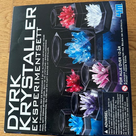Et stort sett med alt du trenger for å gro dine egne krystaller. Her kan du dyrke fem ulike krystaller. Bland alle delene og se en unik krystallform vokse, ingen krystaller blir like. Ingrediensene er giftfrie. Bruksanvisning på norsk følger med.