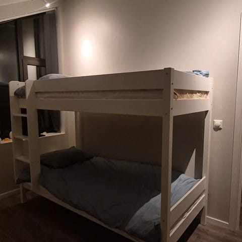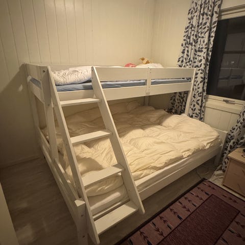Nesten ny familieseng/familiekøyeseng en madrass til salgs. Sengen demontert og selges til HBO 2500 kroner .