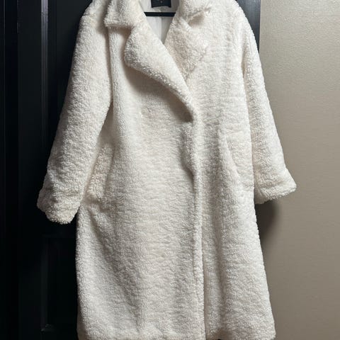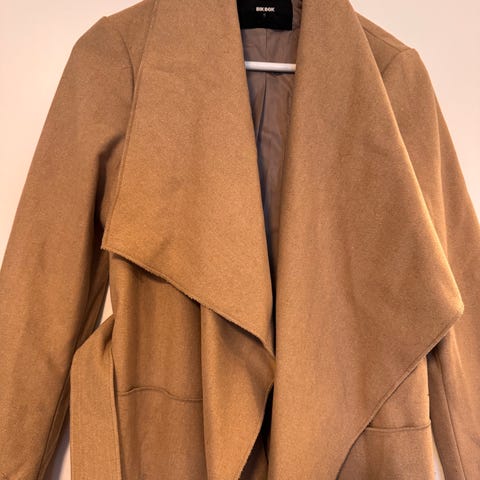 Bik Bok kåpe i størrelse S, laget av ullmateriale. Kåpen har en grå farge og er designet for kvinner. Den har hette og belte for justering.