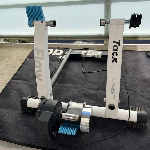 Tacx Blue Matic sykkelrulle med blå ramme og mekanisk motstandssystem. Egnet for innendørstrening av sykler, gir en stabil og justerbar treningsopplevelse.