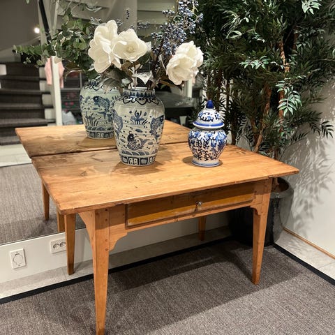 Gammelt, antikk rundt bord i furu. Bena kan demonteres for enkelte frakt. Bordet er helt og pent, bena er litt skeive men enkelt å fikse, og noe brukstegn her og der som er å forvente av et eldre bord.
