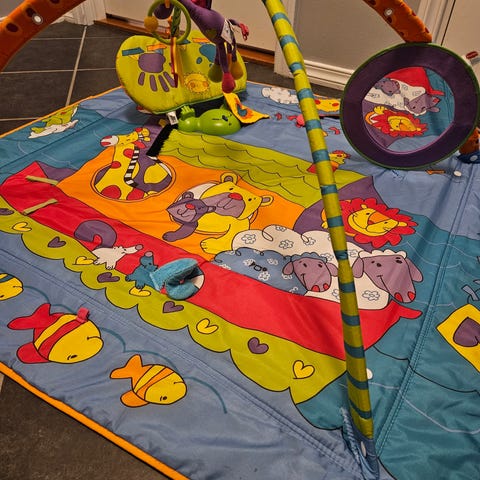 Babygym med fargerike mønstre og myke leker hengende fra buen. Inkluderer flere baller i forskjellige farger. Designet for små barn og babyer for å stimulere lek og motoriske ferdigheter.