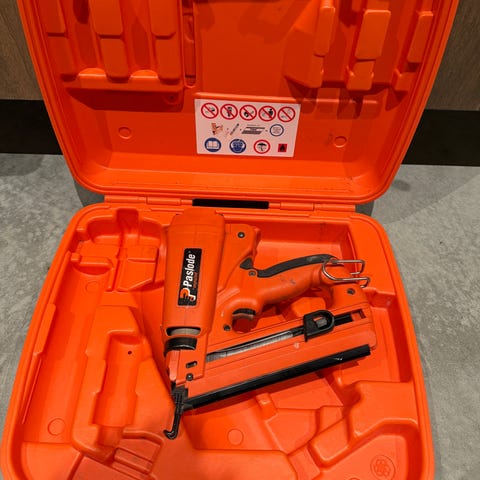 Paslode Impulse IM50 F18 spikerpistol sett med oransje oppbevaringskoffert. Inkluderer spikerpistol, batterilader, batteri og ekstra. Designet for effektiv spikring med gassdrevet teknologi. Egnet for profesjonell bruk i bygge- og tømrerarbeid. Et gassflaske medfølger.