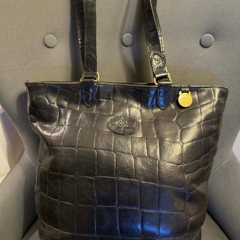 Mørkebrunt skinn med antikk patinert messing. En ytterlomme. En innerlomme med glidelås.