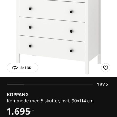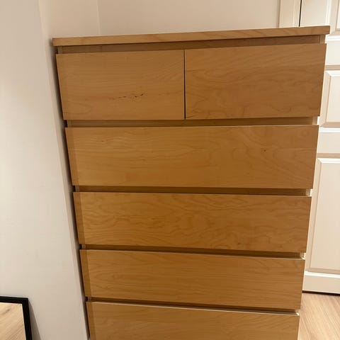 Brun/svart kommode fra Ikea. Begynner å bli litt vinglete, men kan sikkert skrus bedre sammen eller festes til vegg så er det mye bruk igjen. Skuffer fungerer som de skal. Ikke skader eller mangler.
