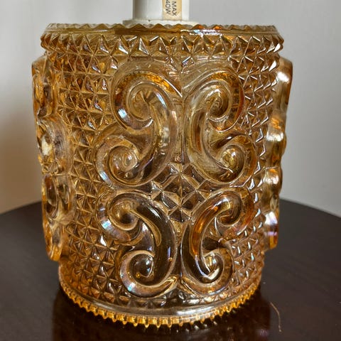 Lampen har et kraftig karnevalglass, lusterglass , peach lustre, marigold i iriserende finish i varm honningtonet farge som gir et helt nydelig, gyllent lys. Ikke skarpt, ikke kjedelig – bare ren kos.