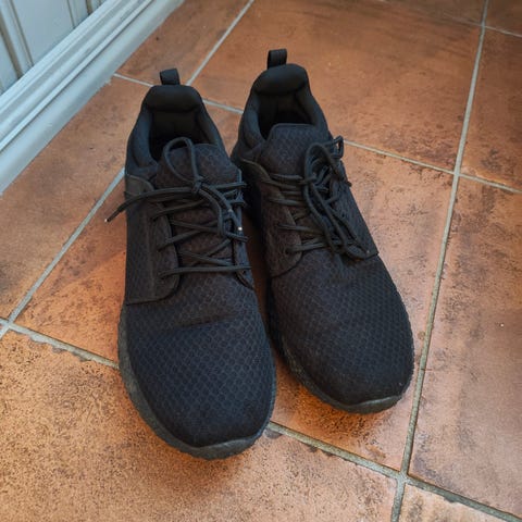 Lite brukte sneakers til herre i størrelse 45 selges. Sorte med røde lisser, behagelige og stabile på foten. Fremstår i god stand med lite slitasje.