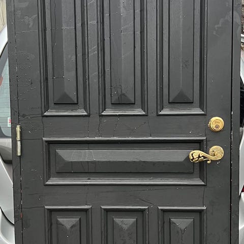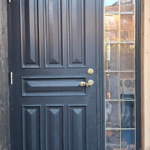 Teak inngangsdør med to ramme. Pen og i god stand. Døren har et horisontalt paneldesign på utsiden og inkluderer to sidefelt med glass. Innsiden glatt. Passer til boligbruk som ytterdør.