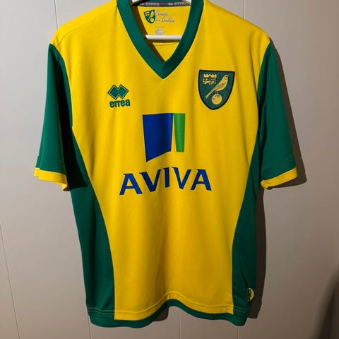 Norwich City fotballtrøye i gul og grønn farge. Trøyen har signatur og logo. Signert av milot rashica. Coa fra firmastella følger med