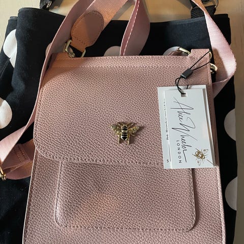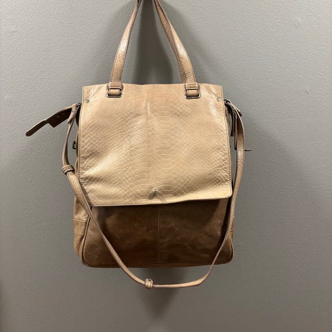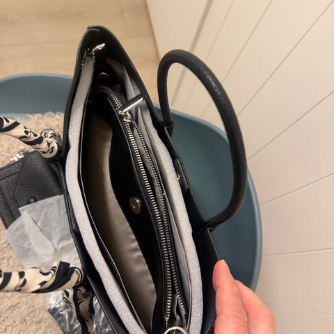 34 cm høy, 32 cm bred. Kraftig skulderstropper. Som ny, kvalitetssømmer. 2 store lommer med glidelåser innvendig. Ren. Kan medbringes Oslo S 0801