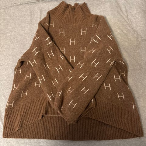HÉST fam short i størrelse 2, laget av ullmateriale. Genseren har en brun farge og et mønster med bokstaven H. Passer til bruk som varmt og komfortabelt ytterplagg.