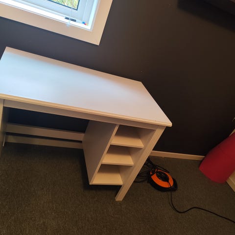 Praktisk og pent brukt skrivebord i furu med noen bruksmerker gis bort. Skrivebordet må hentes/flyttes selv