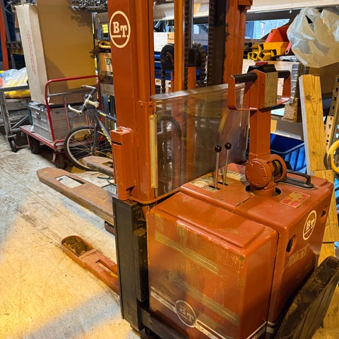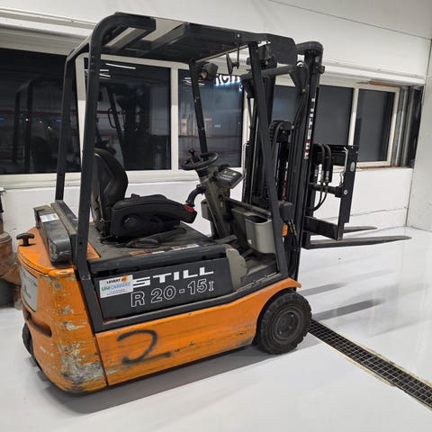 Shinko gaffeltruck med elektrisk drift. Maskinen har en åpen førerplass med styring og kontrollspaker for drift. Egnet for løfting og transport av tunge varer i lager og industrimiljøer.