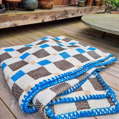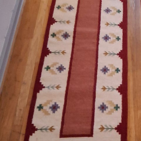 Røllakan ullteppe, flatvevd og kan brukses på begge sider. Det siste bildet er fra baksiden av teppet. Oppgitt mål er med frynser.